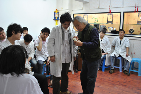 九十年代,蒋宏利从艺术学院毕业,分配到天津特种工艺品厂,非常幸运的是当时厂长就是画家王老师,后来成了蒋宏利艺术老师,从那时开始二人就结下了不解之缘,多年的相处二人如父子般亲密,正是王老师的面面相传,成就了今日玉雕大师蒋宏利。现如今,年逾花甲的王老师颇为自己的高徒感到自豪。一有时间便不辞辛劳地飞来上海,在艺术为爱徙进行指导。